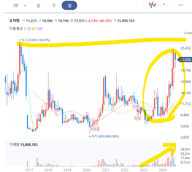 동사의 월봉 차트는 상장 이래 최대 거래량을 동반하여 꾸준히 우상향을 보이고 있으며 10월 15일 발표될 임상 2상 결과에 대한 기대감으로 발표 전까지는 신고가도 바라볼 수 있는 환경을 만들었다고 볼 수 있습니다. 국내 바이오 증시는 뉴스 전에 주가가 많이 오르면 비중 축소를 하면서 매매를 해야 하는 특징(뉴스에 팔아라)이 있으니 이 점 참고하시여 우선은 단기적인 매매관점으로 참고하시길 바랍니다.