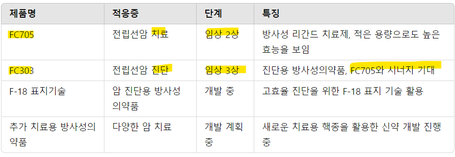 동사는 대표적인 전립선암 치료제인 FC705를 개발 중이며, 이 약물은 기존 항암제에 저항성을 보이는 전립선암을 대상으로 뛰어난 효과를 보일 것으로 기대됩니다. FC705는 현재 임상 2상을 진행 중이며, 임상 결과는 2024년 10월 15일에 발표될 예정입니다. 또한, 전립선암 진단제 FC303도 임상 3상을 진행 중입니다. 이와 같은 신약 개발로 인해 퓨쳐켐은 글로벌 항암제 시장에서 강력한 성장을 기대하고 있습니다.