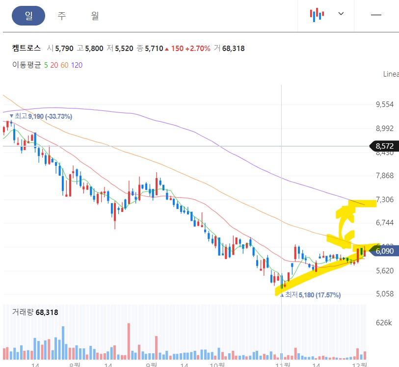 조금 시총이 작지만 반도체소재 및 2차 전지 전해질을 만드는 알짜 강소기업 켐트로스도 그동안 너무 많이 소외를 당했는데 주가는 바닥에서 슬금슬금 올라와 20일선 지지 및 60일선과의 이격을 좁혀 놓은 상태입니다. 이 종목은 60일선과 120선과의 이평선 이격이 크기 때문에 6000원 매수 7300원 매도 기준으로 단기 접근을 한다면 좋은 결과가 있을 거라고 보여지며, 시간이 흐를수록 60일선이 우상향 쪽으로 머리를 든다면 추세 전환이 되어 꽤 큰 상승도 기대되는 바닥 권 알짜 종목입니다.