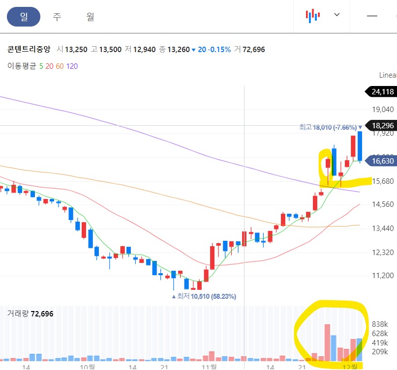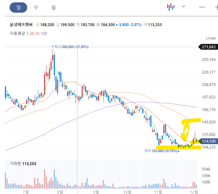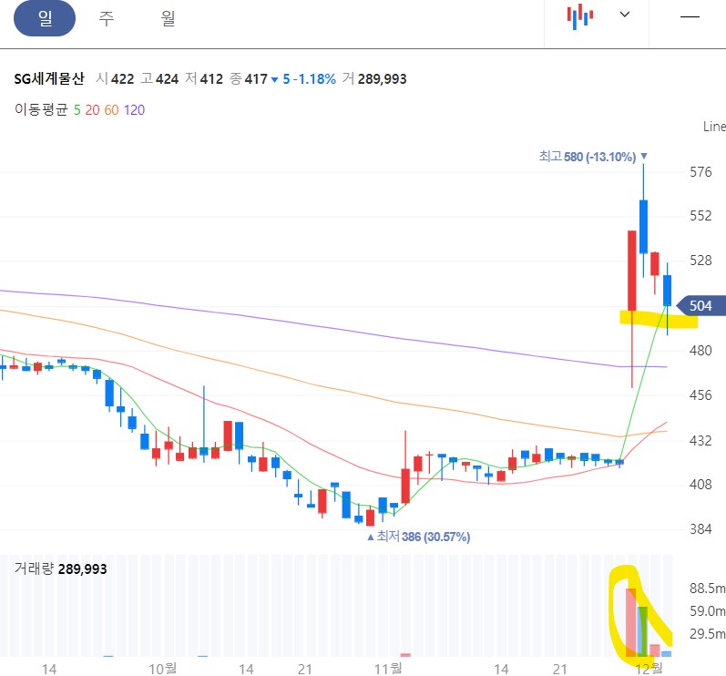 충분히 하락 후 바닥권에서 이중바닥 패턴을 만들었고 20일 이평선위에서 거래량증가 양봉 캔들을 만들고 쉬고 있는데 60일선까지의 이격이 크기 때문에 60일선을 터치하든 돌파하든 거기까지 단기 충분한 급등을 할 수 있습니다. 어제의 음봉은 매수의 음봉이라고 볼 수 있죠. 보통 양봉에서 매수하는 게 좋지만 이렇게 쌍바닥을 잡았을 때는 쌍바닥을 손절로 잡고 음봉에서 매수해도 무방합니다.