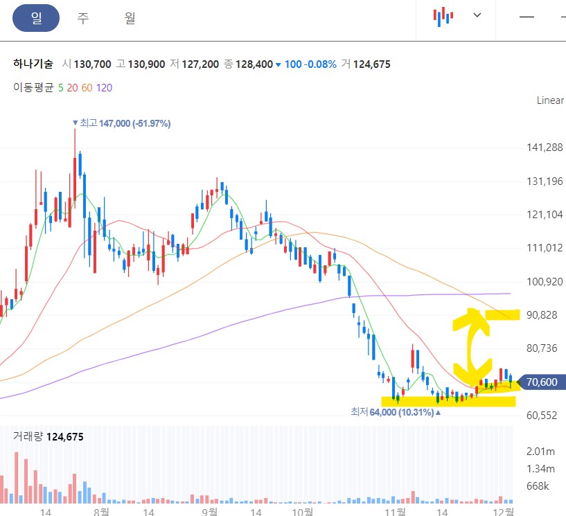 하나기술 역시 20일선을 지지하하면 주가는 지지부진한 모습인데 거래량이 안들어와서 그렇습니다. 60일선과의 이격이 충분함으로 거래량만 들어온다면 9만 원 터치는 어렵지 않을 겁니다. 7만원 매수 9만원 매수 약 30% 수익 보이네요.