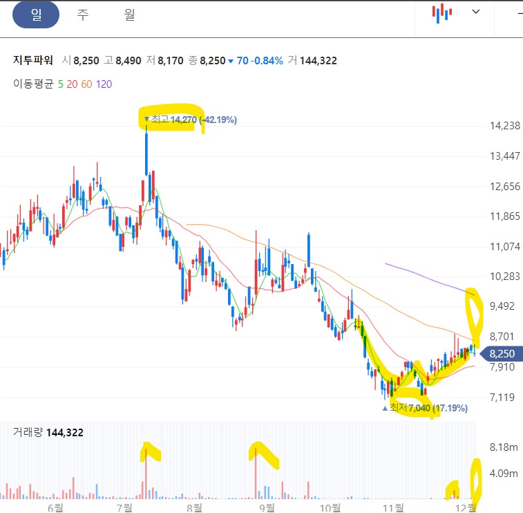 지투파워는 지난 7월 14270원 고점 대비 금번 11월 저점 7040원까지 반토막이 난 상태에서 쌍바닥을 찍고 추세 전환을 시도 중에 있네요. 거래량 증가 장대양봉을 기대해 봅니다.