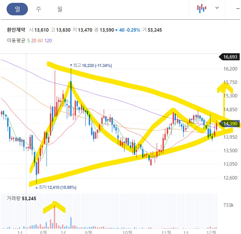 14000원 대에서 오랫동안 위아래 진폭을 주면서 삼각형 패턴을 만든 모습니다. 진폭이 줄어들면서 위로 급등이 예상됩니다. 환인 제약은 이번 뉴스를 계기로 향후 조정 시마다 모아간다면 2024년 큰 상승도 기대해볼 주식입니다.