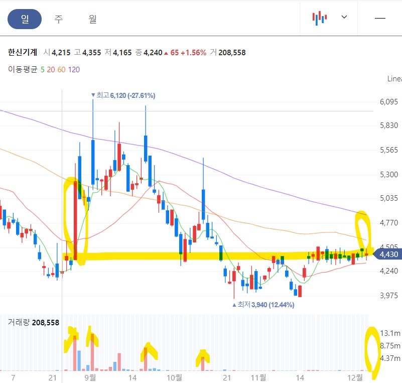 9월에 생긴 거래량 증가 장대 양봉은 기준양봉이 되어 저항 역할을 하고 있지만 갭상승 시 9월에 생겼던 거래량만큼 증가해 준다면 내일 급등도 가능해 보입니다. 단 120일선 저항인 4800원에서는 거래량과 매수세의 힘을 체크해야 합니다.