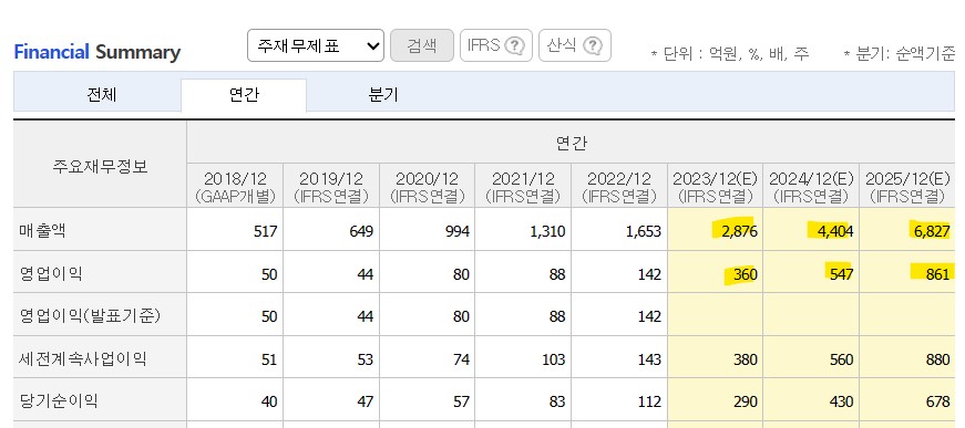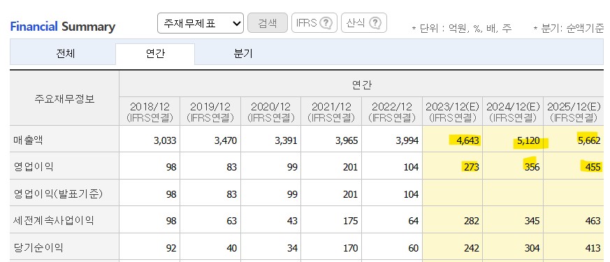 실적 전망치를 보면 올해 매출이 4643억. 영업이익 273억원으로 영업이익은 전년대비 약 150% 성장 하였으며, 25년까지 영업이익이 100억 원 이상씩 증가함을 알 수 있다. 25년 실적을 반영하면 시가총액 약 4500억 원이 적정가로 볼 수 있다. 현재 시총은 2814억 원이다. 상승 여력이 아직 남아있다.