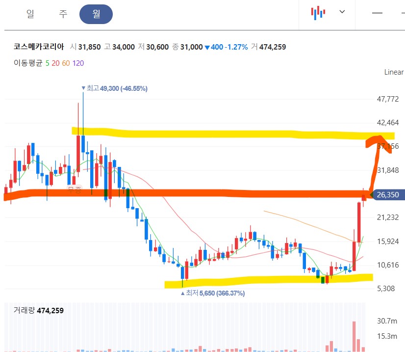 월봉을 보면 현주가는 2016년 상장 시 가격대까지 상승한 상태이며 현재는 저항권이다. 최근 이수페타시스, 펩트론 등의 신고가 종목들을 보면 저항도 뚫고 가는 추세라 동사의 주가도 기대가 된다. 그래도 매수하고 싶다면 눌림목을 공략하자.