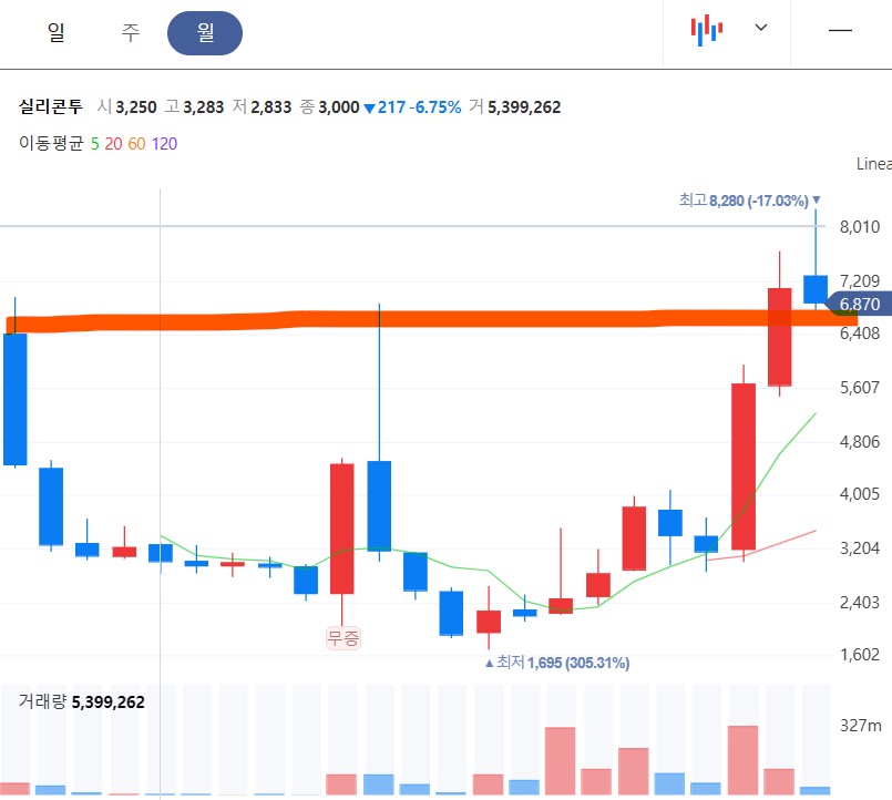 월봉상 신고가를 돌파했으며 새로운 시세가 나올 지 기대가 되는 구간이다. 꼭대기에 있는 주식은 좋아하지 않지만 '시세는 시세에게 물어라'라는 격언이 있다. 지속 추적하면서 공부해 보면 좋겠다.