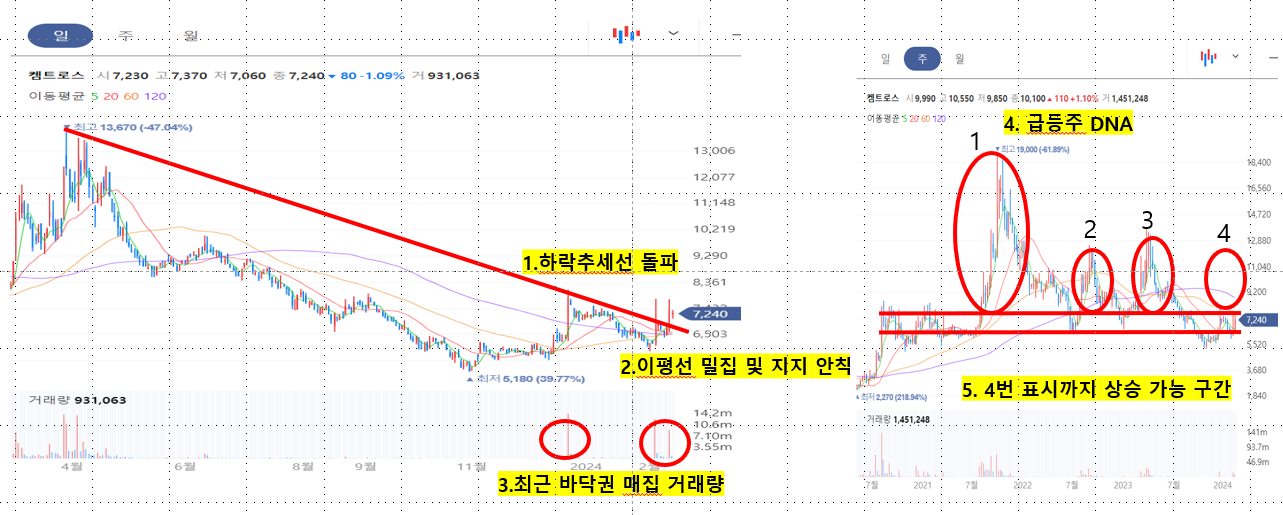 최근 바닥권에서 1000만 주 이상의 거래량증가 장대양봉이 만들어지면서 하락추세를 돌파한 상태로 역배열 급등주 패턴을 보이고 있습니다. 역배열 급등주 패턴은 장기간 하락한 주식이 바닥권에서 매집형의 장대양봉이 출회되면서 하락 추세 돌파 후 이평선 밀집 후(20일선, 60일선을 돌파 지지했을 때 강력함) 나타나는데 동사의 주가가 그에 부합하고 있습니다. 주봉상 4번 구간까지 상승할 수 있는 흐름을 예상해 볼 수 있습니다. 단, 위에 8천 원 선에 240일선 저항이 있어 단기 돌파여부에 따라 주가가 한번 밀리고 갈 수도 있어 보입니다. (240일선은 위 그림에서는 안보임)
