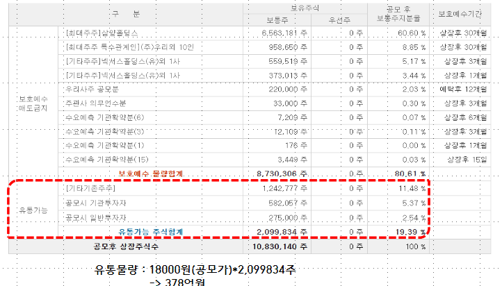 정리하자면, 공모가는 18,000원 / 시가총액은 상장 당시 1,949억 원 / 유통물량은 378억 원으로 대기업 계열자의 품절주라는 매력을 가진 것을 확인할 수 있었습니다.