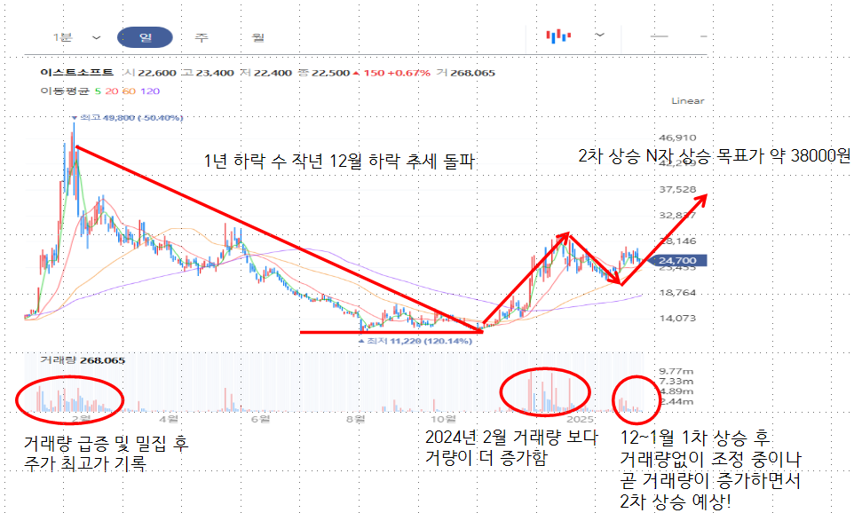 이스트 소프트 외 대부분의 AI소프트웨어 종목이 위와 같은 차트를 가지고 있습니다. 이번 뉴스로 거래량이 다시 급증한다면 2차 상승파가 시작될 것으로 보이며 이 번 2차 N자 파동의 목표값은 대략 37,000~39,000원으로 예상됩니다.