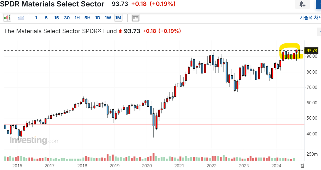 XLB는 신고가를 경신 중에 있으며 미국 S&P 500 지수 패턴과 방향성은 같으나 다소 높은 수익률을 기록중입니다.