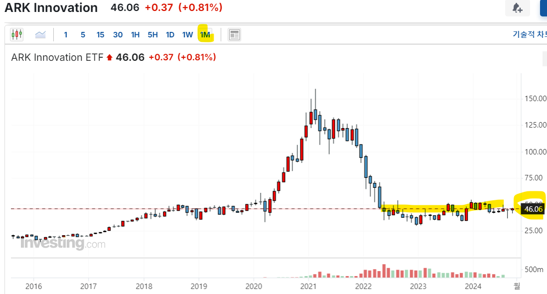 ARKG는 월봉 차트상 아직 시작도 안 했으며 가장 늦게 출발할 것으로 보여 위 셋 중 가장 투자 매력도가 높은 상품이 아닐까 하는 개인적인 견해를 남깁니다. 돈나무 언니 캐서리 우드가 투자하고 있어서 매력도가 높다고 할까? (하지만, 올해 돈나무 언니가 투자한 펀드 수익률이 저조하다고 하니 이점은 참고하세요)