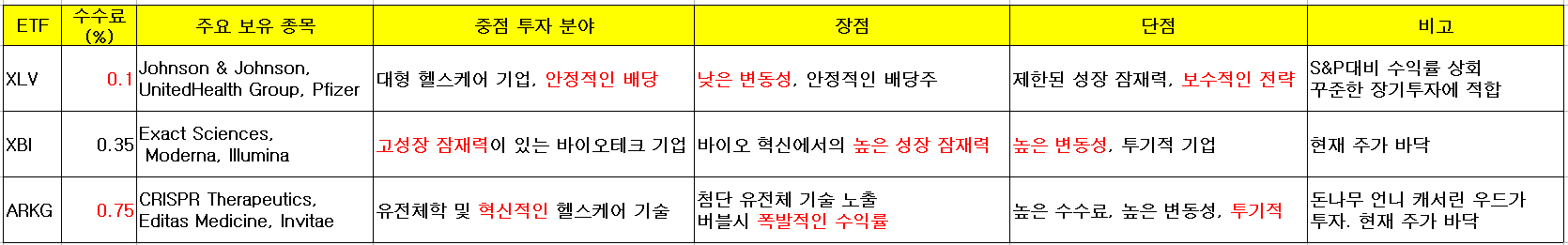미국 주식 헬스케어 관련 대표적인 ETF 중에 꼽을 수 있는 상품으로 XLV, XBI, ARKG가 있습니다. 각 ETF의 특징 및