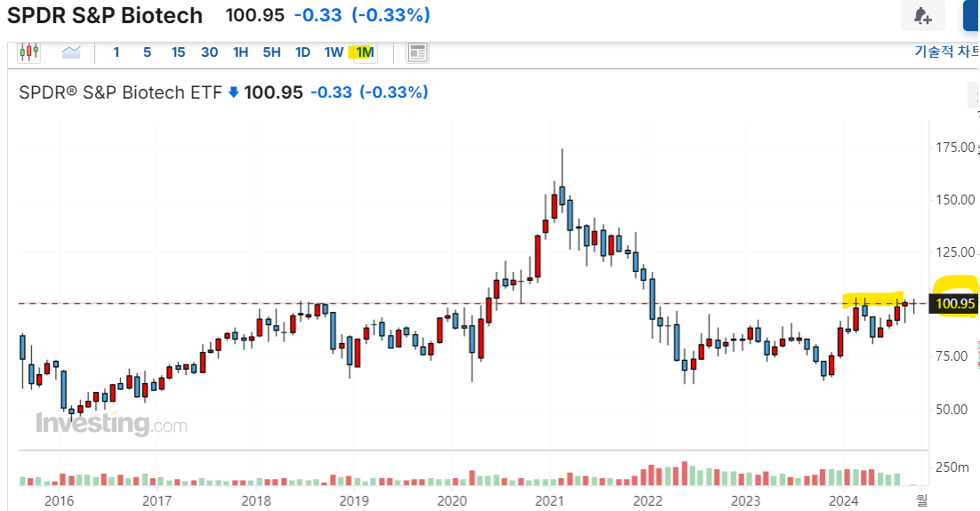 XBI 월봉 차트상 전고점 돌파를 눈앞에 두고 있으며 저금리 시대에 맞춰 이제 시작을 한 듯한 퍼포먼스를 보이고 있습니다.